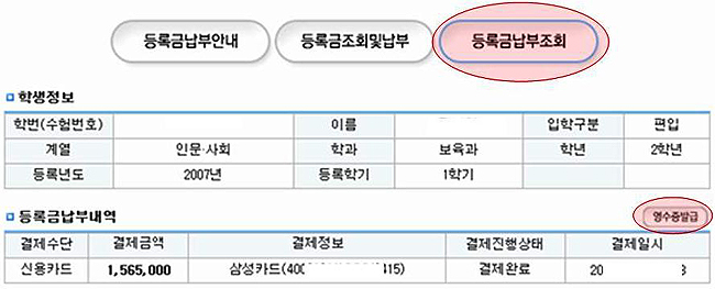 1. 수강신청 완료 후 [등록금 납부] 메뉴에서 확인 가능 2. 신입생 : 입시지원번호+비밀번호(주민번호뒤 7자리) 로그인 → 수강신청 → 등록금 납부 3. 재학생 : 인증서 로그인 → 마이페이지 → 등록금납부 4. 학생정보, 등록금 내역 및 납부기간 확인 ① 학생정보 : 학과, 학번, 이름 ② 학생회비 : 납부 안하실 경우 반드시 ‘학생회비 납부 안함’ 선택 ③ 등록금 내역 : 수업료, 장학금 및 총 납부 금액 확인 ④ 납부기간 : 신입생의 경우 납부 기간이 지나면 합격 취소되오니 유의 5. 결제방법 ① 신용카드 납부 : 카드사 선택 → 카드번호, 유효기간, 할부개월수 입력 ② 가상계좌 조회납부 : 은행선택 → 가상계좌번호 발급 → 해당 계좌로 입금(입금자명 무관) ③ 장학금 납부 : 장학금 금액이 반영되어 있는지 확인하고 총납부금액 확인 후 납부버튼 클릭(우선감면자의 경우 총납부금액‘0원’ 이 맞는지 확인)