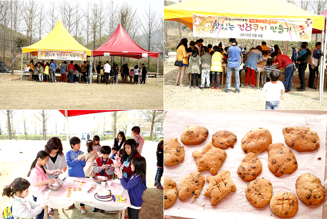 2013년 5월 4일 학교에서 어린이날을 맞아 우리대학 학생인 부모님을 따라 학교를 찾은 어린이들을 대상으로 ‘어린이를 위한 건강 쿠키(채소 초코칩 쿠키, 검은 깨 쿠키) 만들기’ 란 주제를 가지고 요리를 통한 아동교육 실습을 진행하였습니다. 야채 쿠키나 검은깨 쿠키를 어린이들이 직접 만들어 먹어 보는 과정을 통해 어린이들이 싫어하는 식품들에 대한 거부감을 줄이는 편식 교정 교육과 재료 식품의 특성과 효능설명을 통한 영양 교육의 효과가 있습니다. 또한 다양한 식품 재료들을 직접 보고, 만지고, 맛보는 과정을 통해 오감을 자극 하는 활동으로도 효과가 있습니다. 이론적으로 배운 것을 토대로 어린이들의 눈높이에서 직접 프로그램을 계획하고 평가해 볼 수 있는 기회가 되었습니다. 무엇보다도 쿠키 만들기에 열중하는 아이들의 모습이 진지하면서도 즐거워 보여 의미 있는 실습 이었습니다.