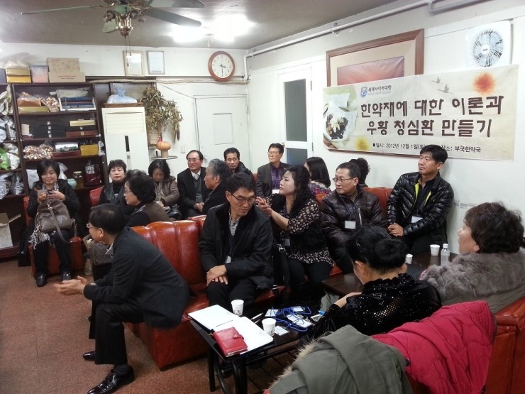 항 목 | 세 부 내 용 | 수업장소 | 동대문구 제기동 1140-31번지 부국한약국(두리약업사) | 수업일시 | 2012년 12월 1일 (토) 15:00 ~ 18:00 | 수업내용 | 15:00~16:30 사향구분법/30여 가지 약재 이론 강의 16:30~18:00 우황청심환 만들기 | | |