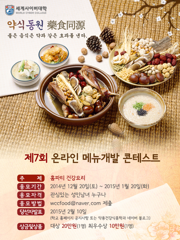 최근 기력을 보강하고 원기를 회복하는 보양식이 주목 받고 있다. 약(藥)의 근원은 먹는 것(食)과 같다는 의미의 '약식동원(藥食同源)' 정신에 미루어볼 때 우리네 밥상은 질병을 예방하고 건강을 증진하는 점에 있어 약만큼이나 중요한 역할을 한다. 이에 세계사이버대학은 우리 조상들의 약식동원 정신에 기초하여 건강한 밥상을 위한 좋은 메뉴를 개발하여 함께 나누는 제7회 온라인 메뉴개발 콘테스트를 진행한다고 밝혔다. 주제는 '홈파티 건강요리‘로 연말연시, 집들이, 생일파티 나만의 건강요리를 선보이면 된다. 응모기간은 2014년 12월 20일부터 2015년 1월 20일까지이다. 성인남녀 누구나 응모할 수 있으며, 이메일(wccfood@naver.com)로 제출하면 된다. 제출 양식은 세계사이버대학 홈페이지 또는 네이버 블로그를 통해서 양식을 다운 받으면 된다. 당선자 발표는 2015년2월10일 학교 홈페이지 공지사항과 약용건강 식품과 네이버 블로그를 통해 발표된다. 상금 및 상품은 대상 20만 원(1명), 최우수상 10만 원(1명) 제출된 자료는 세계사이버대학 약용건강식품학과 입시 홈페이지 및 블로그에 게시될 예정이다. 한편 '음식을 약(藥)으로, 약(藥)을 음식으로'라는 모토 아래 맞춤식 건강 디자이너 교육을 시행하고 있는 세계사이버대학 약용건강식품학과는 건강산업 및 기능성 식품 사업 분야에 있어 시대의 흐름을 선도할 수 있는 미래지향적인 인재를 육성하는 데 주력해 왔다. 한방 이론과 식품영양학이론을 접목한 교육철학을 바탕으로 관련과목을 이수하면, 한국직업능력개발원에 등록되어 있는 약선식품전문가 아동요리교육전문가 취득 및 총장명의수료증 수지요법, 티테라피스트 취득이 가능하다. 2001년 문을 연 세계사이버대학 약용식품학과는 약선식품전문가, 아동요리교육전문가, 티테라피스트, 수지요법 등 학과자격증과 함께 위생사, 식품산업기사 등 국가자격증의 취득을 지원하고 있으며 선택과목을 활용해 다양한 진로의 진출을 모색할 수 있도록 활로를 열어두고 있다. 온라인 메뉴개발 콘테스트에 대한 자세한 내용은 전화로, 세계사이버대학 약용건강식품학과 입학 및 편입 문의는 세계사이버대학 홈페이지로 문의할 수 있다. [매경닷컴 뉴스센터] |