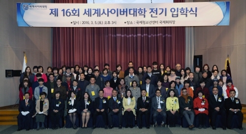 세계사이버대학이 국제청소년센터 유스호스텔(방화동 소재) 국제회의장에서 제16회 세계사이버대학 입학식을 지난 5일 진행했다고 밝혔다. 이번 입학식에는 신, 편입생과 가족, 동문 등 약 200여명이 참가했다. 남희수 목사(사회복지학과장)의 사회와 조항대 교수(선교학과장)의 기도로 진행된 1부 예배와 2부 입학식은 이주연 학사운영처장(상담심리학과장)의 사회로 입학생 대표인 안성진(실용음악과)의 신입생 선서에 이어 조현주 총장의 입학허가 및 환영사가 있었다. 이후 학사운영처 주관으로 학사 및 강의 수강과 관련한 오리엔테이션을 진행했으며, 각 학과별로 교수와 조교들과 함께한 자체 오리엔테이션으로 공식 행사를 마쳤다. 이후 저녁식사에 이어 개최된 총학생회 주관의 신, 편입생 환영회는 NGO다문화복지학과 이영춘 교수의 레크레이션 및 각 학과별 장기자랑이 이어졌다. 행사를 주관한 서민(NGO다문화복지학과) 총학생회장은 "모든 신, 편입생이 함게하는 자리는 아니었지만 참가한 학생 모두가 대학 생활을 위한 필수 정보를 취득하였고 또한 신입생 환영회에서 교수님과 조교선생님들과의 스킨십을 할 수 있었던 매우 즐겁고 유익한 시간이었다"고 전하였다.