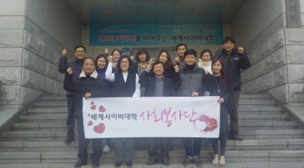 세계사이버대학(총장 조현주)는 지난 12일 교직원이 함께 참여한 ‘세계사이버대학 사회봉사단 발대식’을 개최했다고 19일 밝혔다. 교직원 10여명이 참석한 가운데 열린 이번 행사는 봉사단 대표자(사회복지학과 남희수 교수) 선서에 이어 2017년 사회봉사단 운영 안내 순으로 진행됐다. 사회봉사단은 나눔봉사, 돌봄봉사, 재능기부, 환경사랑실천 등의 계획을 마련하고, 앞으로 실천에 나설 예정이다. 이날 발대식에서 조현주 총장은 “대학의 역할 중에서 지역사회봉사 기능을 강조하기 위해 사회봉사단을 만들게 됐다"면서 "특히 기독교 정신을 기반으로 하는 우리 대학의 사랑과 나눔 정신을 실천하는 사회봉사단으로 발전하길 바란다"고 말했다. |