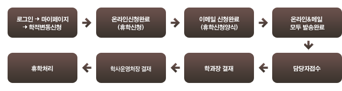 * 상기 신청절차의 온라인신청, 이메일신청 두 가지 신청 방법 모두 신청하여야 학적변동 처리 완료 됩니다.