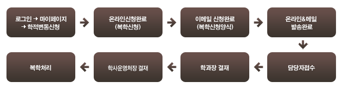 * 상기 신청절차의 온라인신청, 이메일신청 두 가지 신청 방법 모두 신청하여야 학적변동 처리 완료 됩니다.