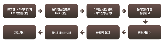 * 상기 신청절차의 온라인신청, 이메일신청 두 가지 신청 방법 모두 신청하여야 학적변동 처리 완료 됩니다.
