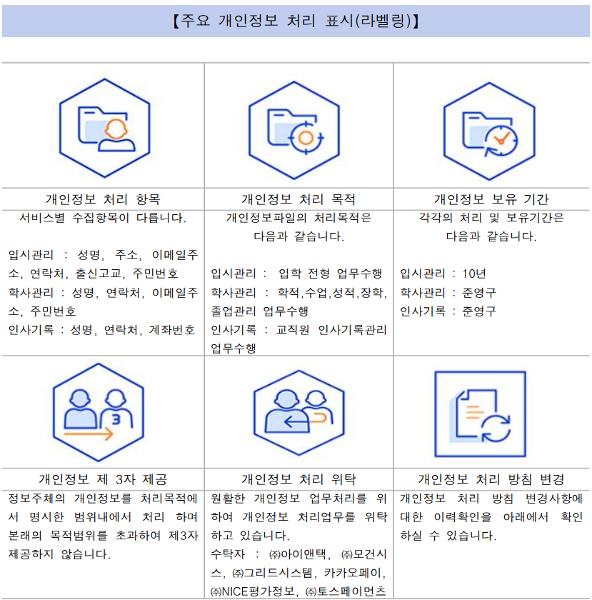 | 입시지원자명단 | 고등교육법시행령 제35조(입학전형자료) / 고등교육법시행령 제73조(고유식별정보의처리) |