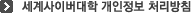 세계사이버대학(https://www.world.ac.kr 이하‘본교’)가 취급하는 모든 개인정보는 관련법령에 근거하거나 정보주체의 동의에 의하여 수집·보유 및 처리되고 있습니다.[개인정보보호법]은 이러한 개인정보의 취급에 대한 일반적 규범을 제시하고 있으며, 세계사이버대학는 이러한 법령의 규정에 따라 수집/보유 및 처리하는 개인정보를 공공업무의 적절한 수행과 국민의 권익을 보호하기 위해 적법하고 적정하게 취급할 것입니다.